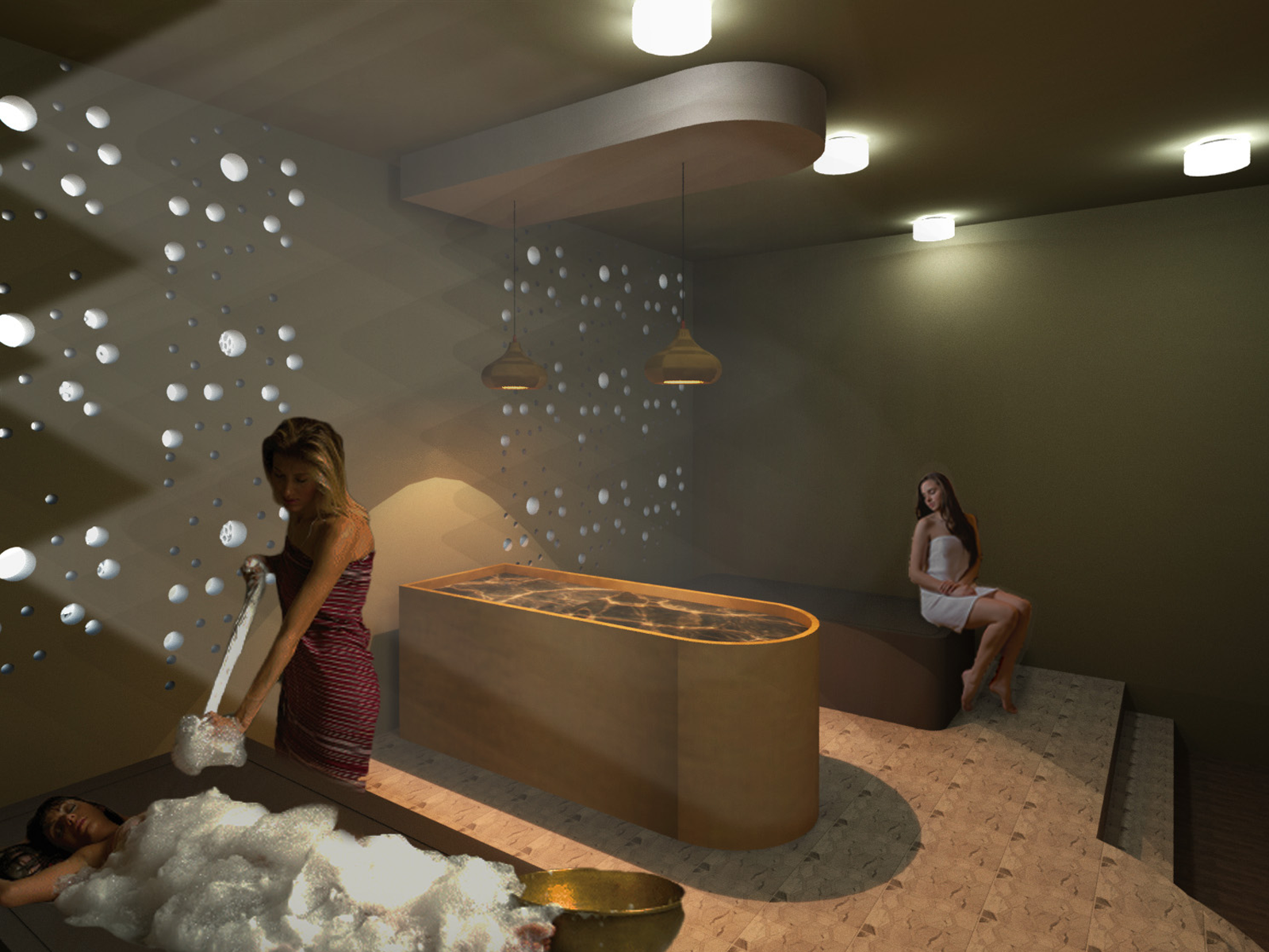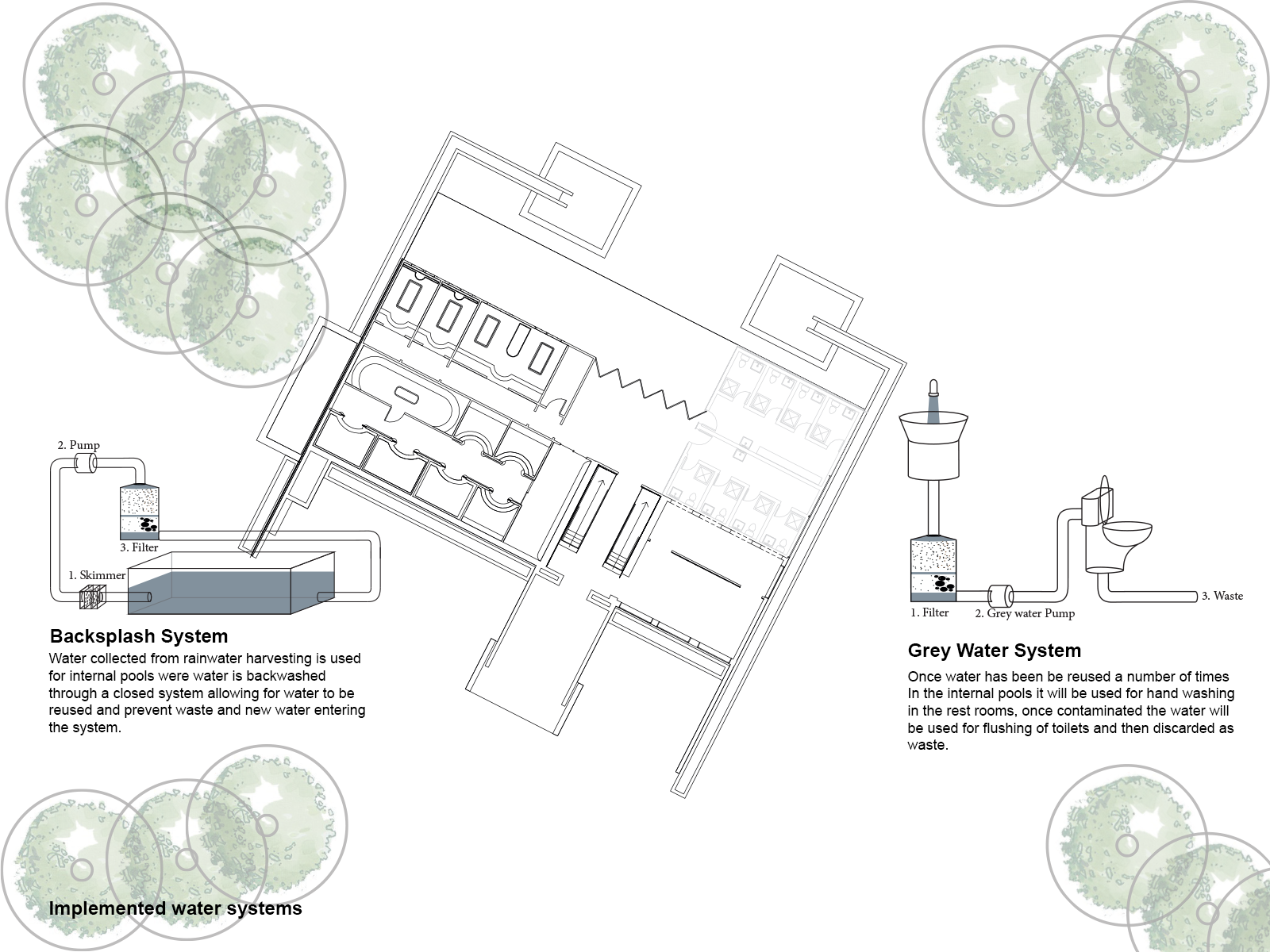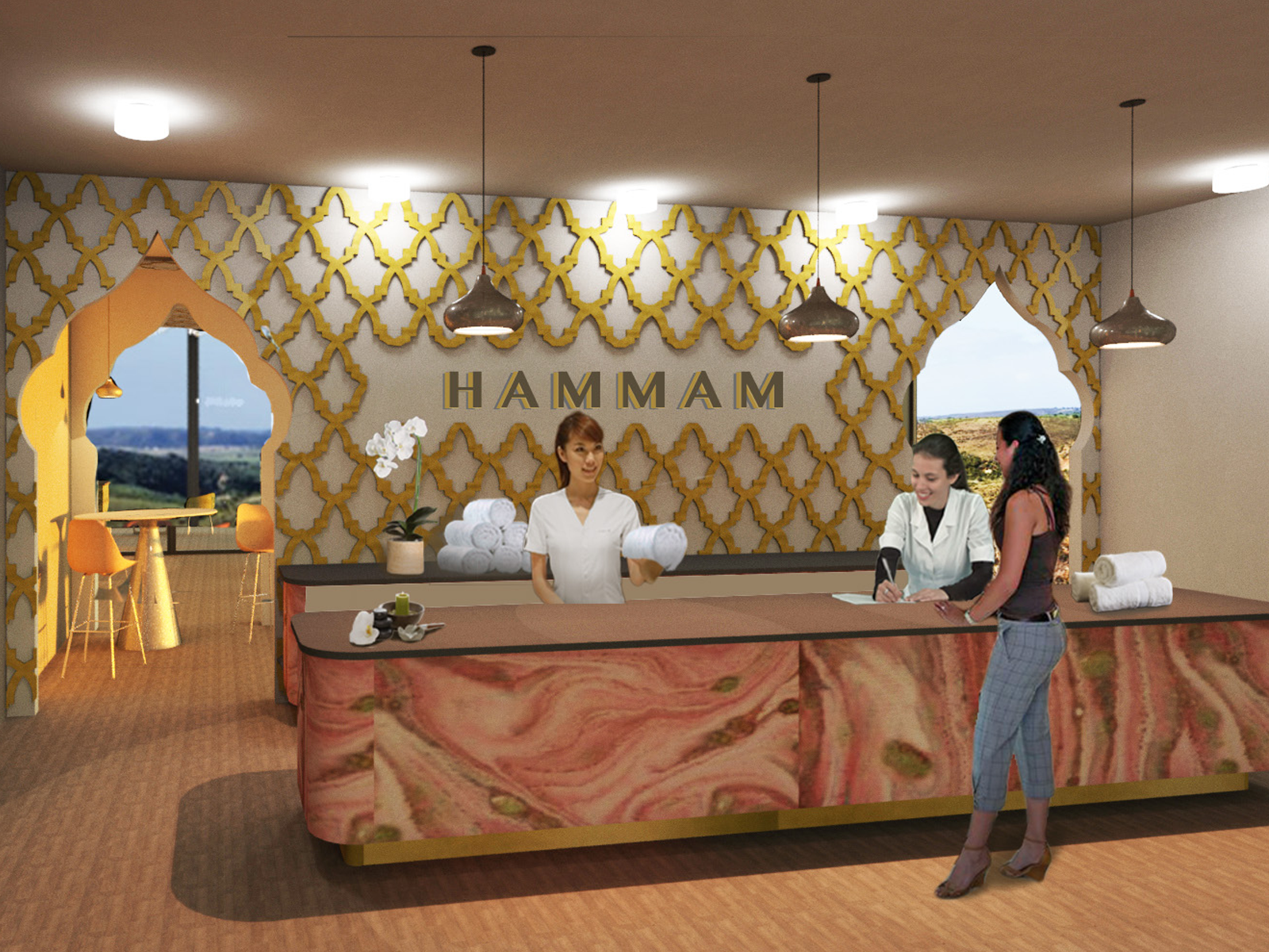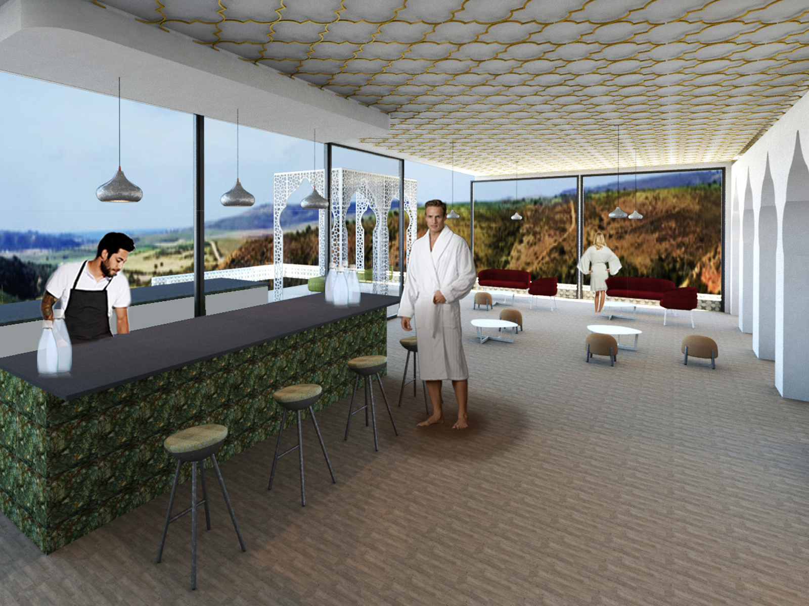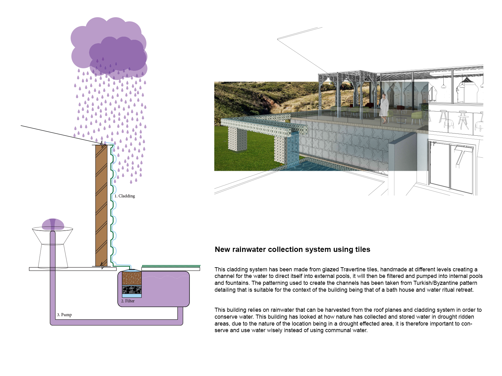 The Hammam wellness centre is a 3 month research concept inspired by how a prickly pear cactus has a way to survive in drought ridden areas by collected moisture and dew during the night. The tile cladding system of Hamman Spa has been inspired by the pores of the prickly pear plant, through its silky, smooth yet contoured surface recreating direction for water flow into storage and filtration units within the spa.