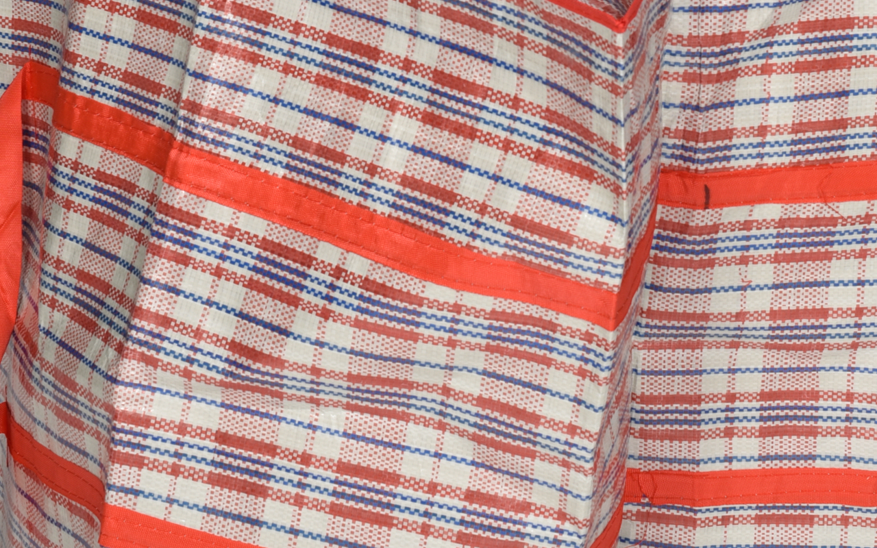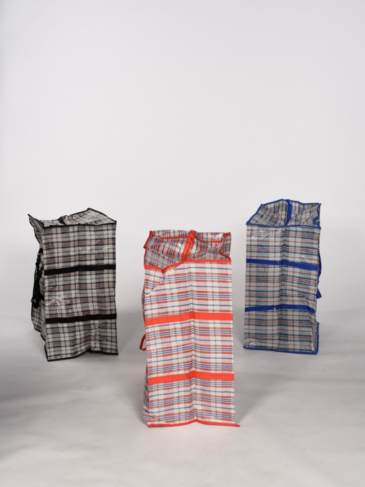 Umaskhenkethe (the one with lines) or Unomgcana (traveller) or China bags these particular bags are a symbol for those who migrate from the countryside to the city on South Africa, many people living in the outskirts and rural sections of the country use these bags to hold all their personal belongings metaphorically, ‘their homes’ in order to transport them to the city where they relocate.